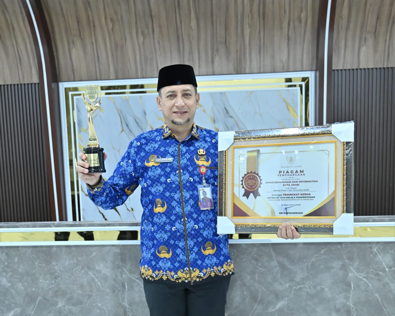 Apresiasi berupa piala, piagam penghargaan serta uang pembinaan itu diserahkan langsung oleh Pj Wali Kota Jambi Sri Purwaningsih didampingi Sekretaris Daerah (Sekda) Kota Jambi A Ridwan, yang diterima oleh Kepala Dinas Kominfo Kota Jambi Abu Bakar.