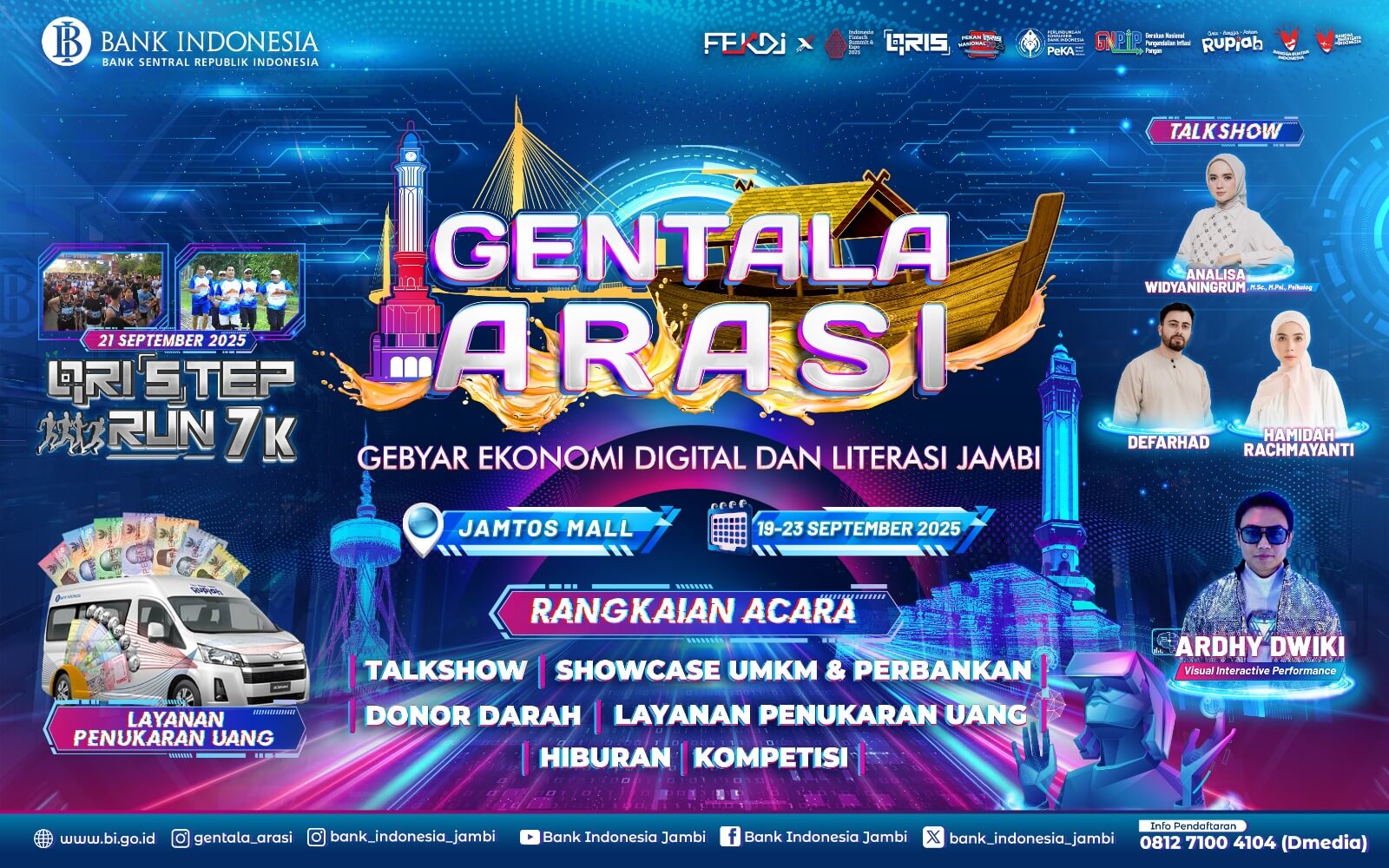 Gentala Arasi 2025 akan diselenggarakan di Jambi Town Square dengan mengangkat tema ”Akselerasi Ekonomi Keuangan Digital untuk Pertumbuhan Ekonomi Jambi yang Berkelanjutan”.
