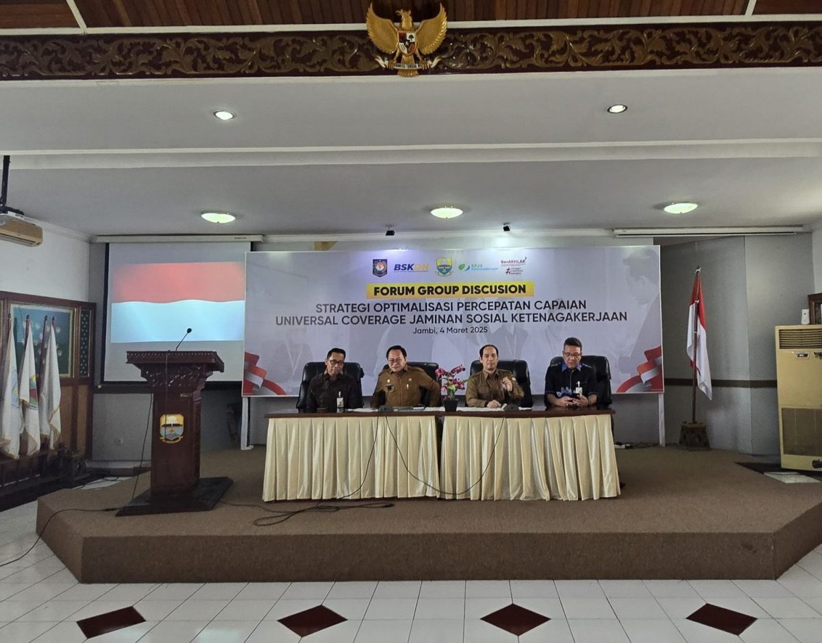 JAMBI, CERITAJAMBI.COM – BPJS Ketenagakerjaan Cabang Jambi bersama Pemerintah Provinsi Jambi menggelar strategi optimalisasi percepatan Universal Coverage Jaminan Sosial Ketenagakerjaan di Balitbangda Provinsi Jambi, Selasa 4 Maret 2025.