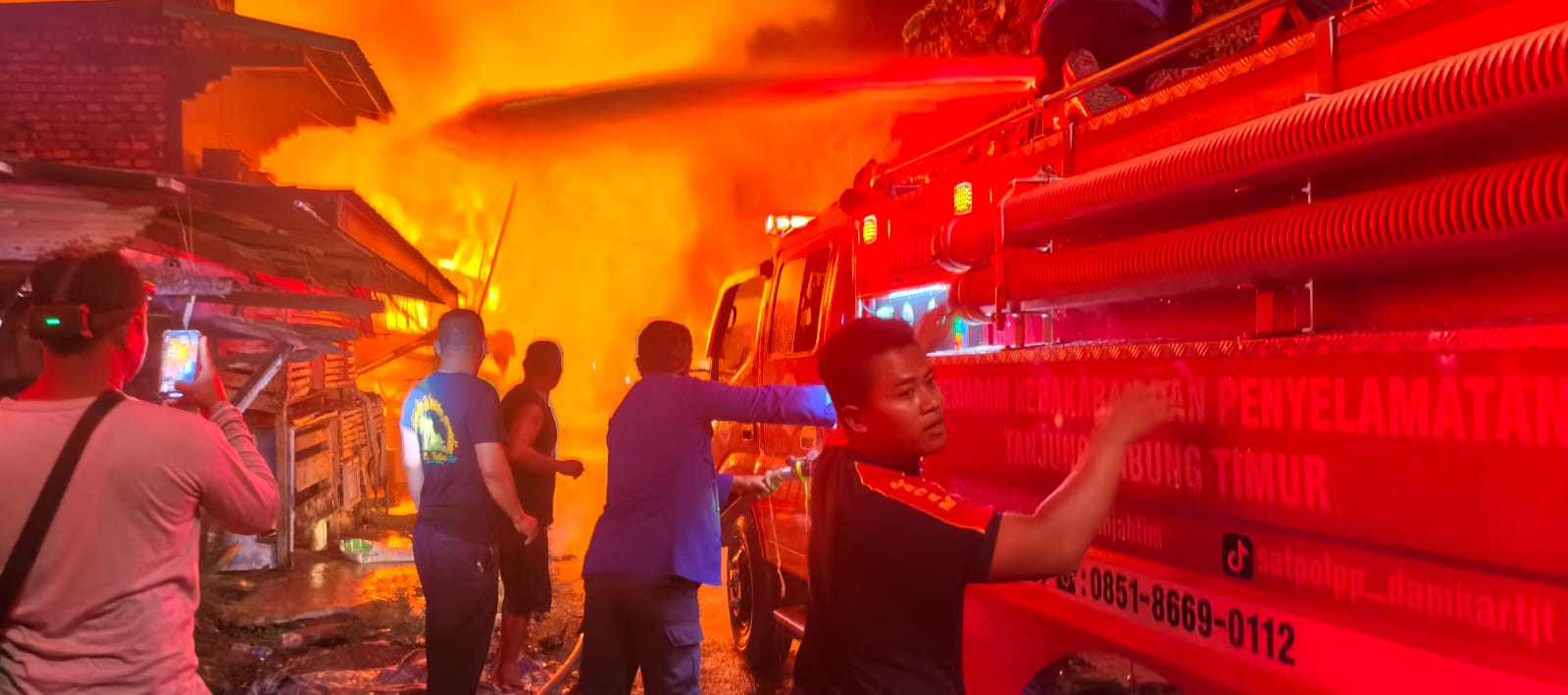 Kejadian kebakaran terjadi di kawasan Pasar Blok D, Kelurahan Pandan Jaya, Kecamatan Geragai, Kabupaten Tanjab Timur, Kamis 12 Maret 2026, sekitar pukul 23.40 wib.