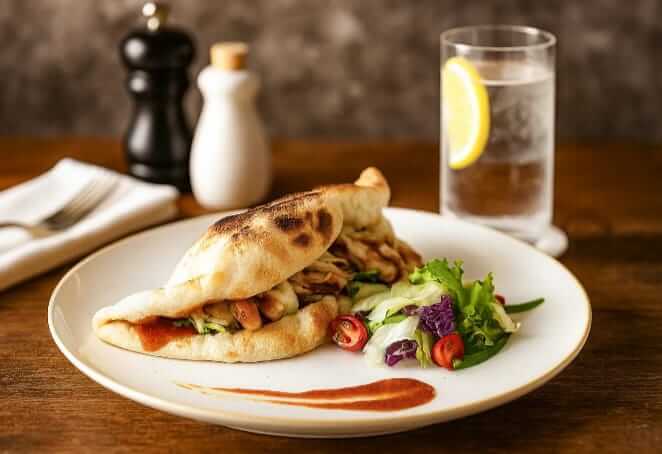 pizza yang lembut dengan isi potongan ayam saus barbekyu tom yam, irisan tomat, mentimun, selada, tumis paprika, dan saus mayones, dengan rasa gurih yang berpadu sempurna bersama minuman segar sebagai pelengkap.