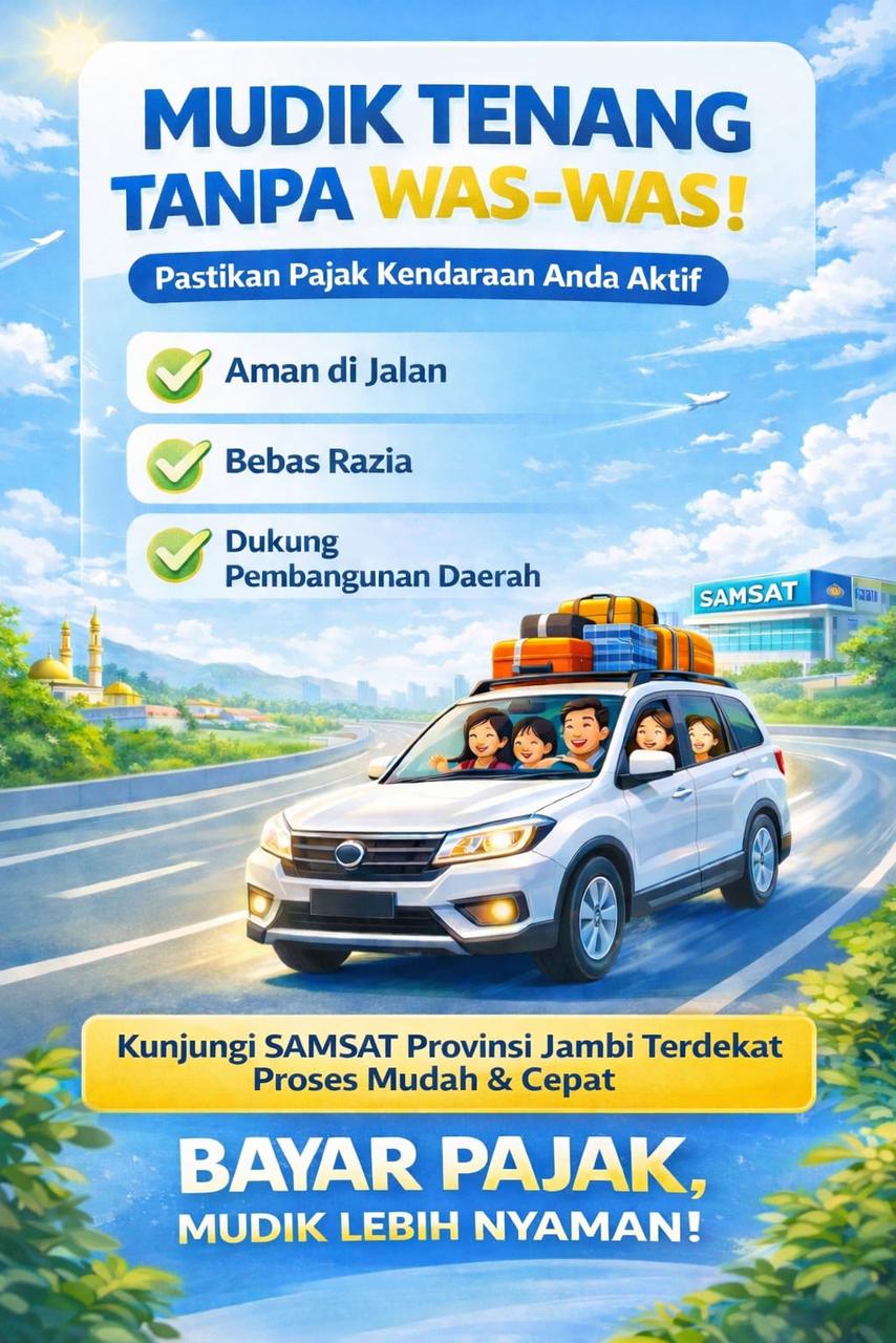 JAMBI,CERITAJAMBI.COM- Menjelang musim mudik, masyarakat diimbau untuk memastikan kendaraan yang digunakan telah memenuhi seluruh persyaratan administrasi, salah satunya dengan membayar pajak kendaraan tepat waktu. Dengan pajak kendaraan yang aktif, perjalanan mudik menjadi lebih tenang, aman, dan bebas dari kekhawatiran saat berkendara di jalan.