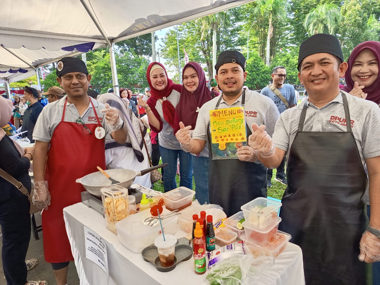 JAMBI, CERITAJAMBI.COM – Gelaran lomba masak nasi goreng dalam rangka Hari Jadi Pemerintah Kota Jambi tahun 2025 berlangsung meriah. Salah satu tim yang mencuri perhatian adalah Trio Dinas PUPR Kota Jambi yang terdiri dari Kepala Dinas PUPR Momon Sukmana, Kabid Bina Marga Agus Setiawan, dan Kabid Sumber Daya Air (SDA), Berlianto.